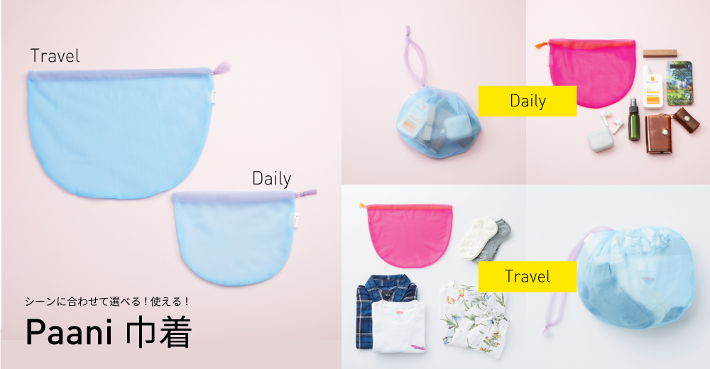 ふんわり柔らかく透け感のある生地が特徴的なPaani巾着は2サイズ展開。